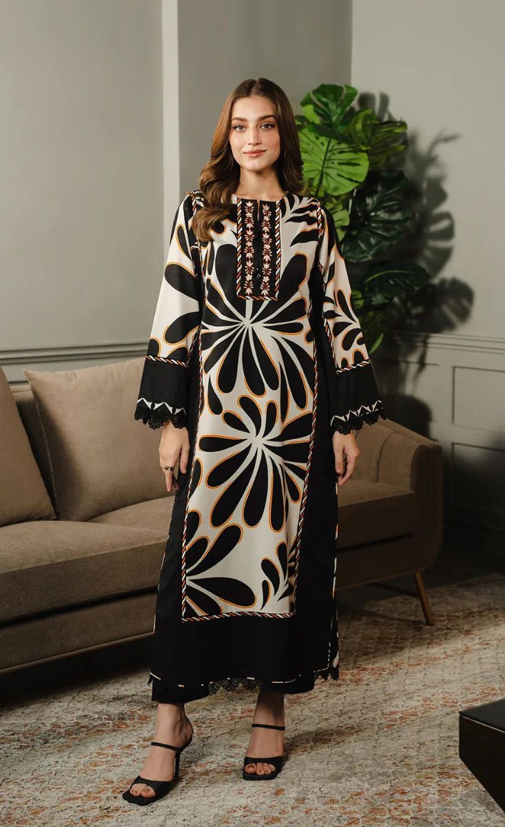 Turn heads with this stunning black and white printed long kurta featuring a bold abstract floral pattern. The front panel is adorned with intricate embroidery and contrast detailing that adds depth and sophistication. Crafted from high-quality, breathable fabric, this kurta combines modern artistry with traditional charm. Its flowy silhouette and statement sleeves make it perfect for casual gatherings, office wear, or semi-formal events. Pair it with black trousers or cigarette pants for a polished look.