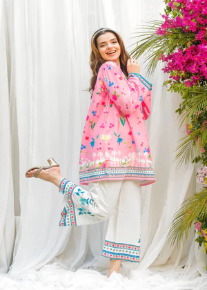 The soft pink printed shirt paired with a white trouser creates a refreshing, elegant look perfect for daily and semi-formal wear.